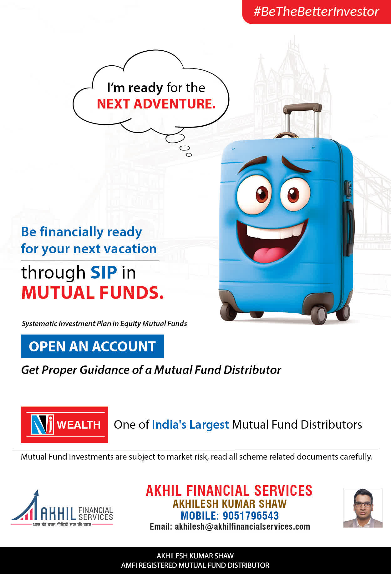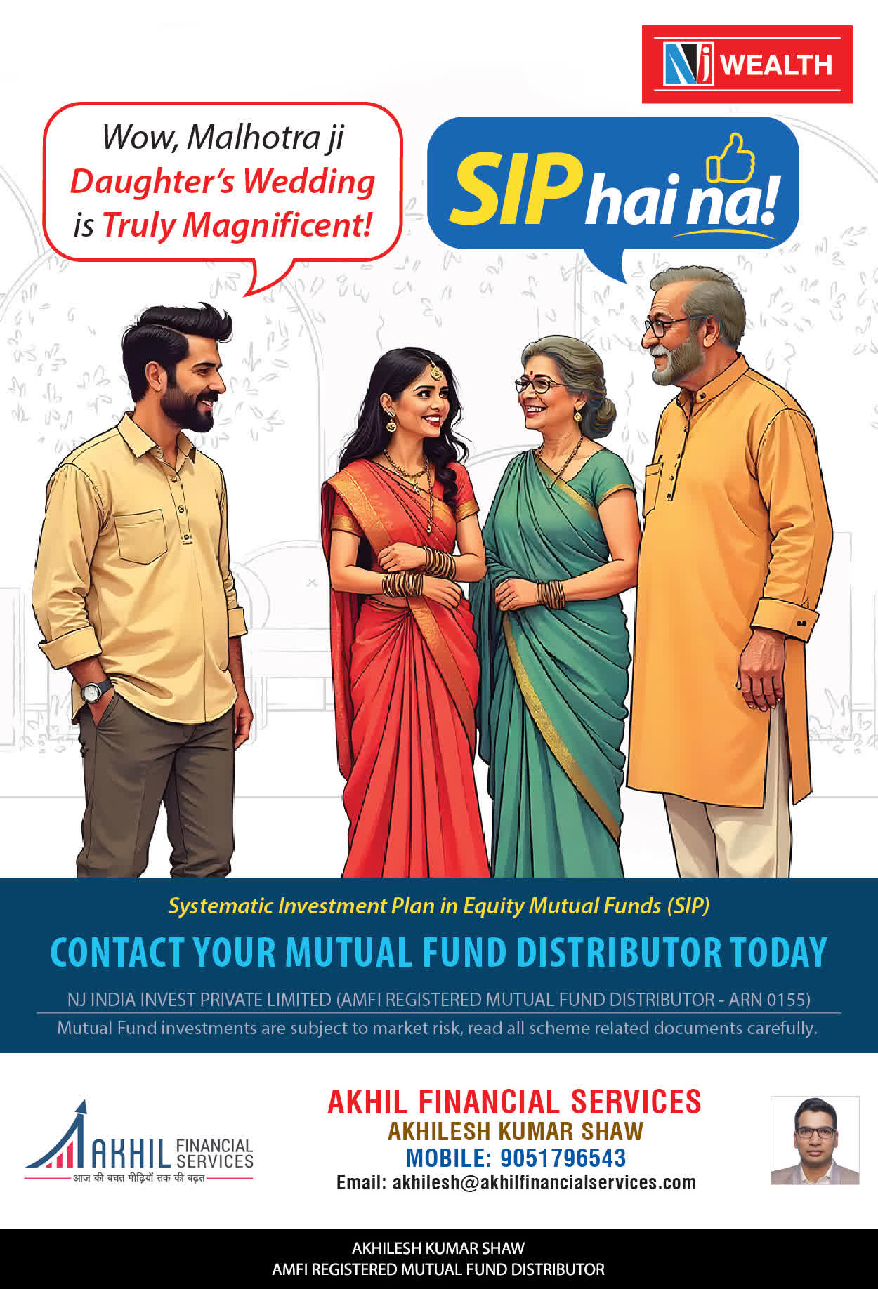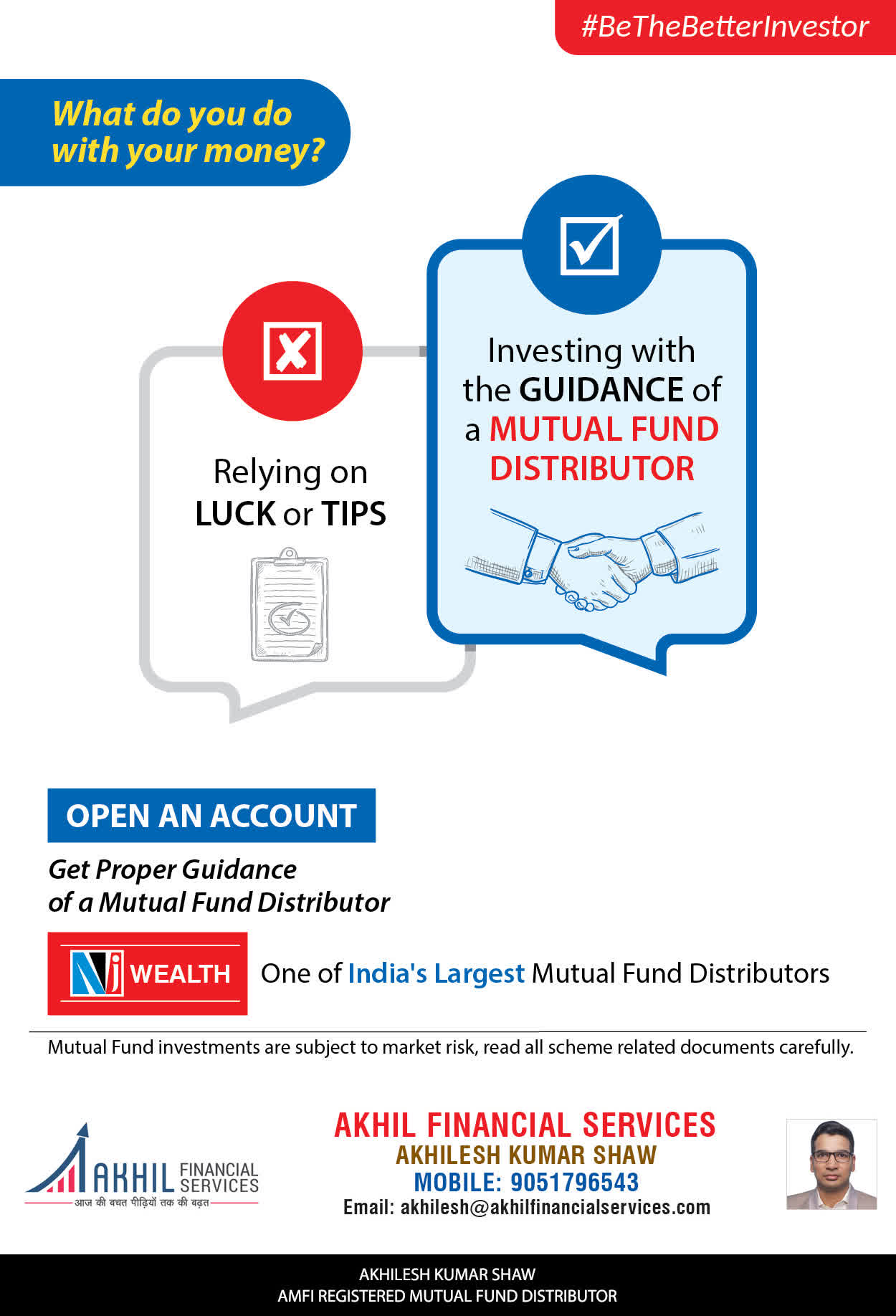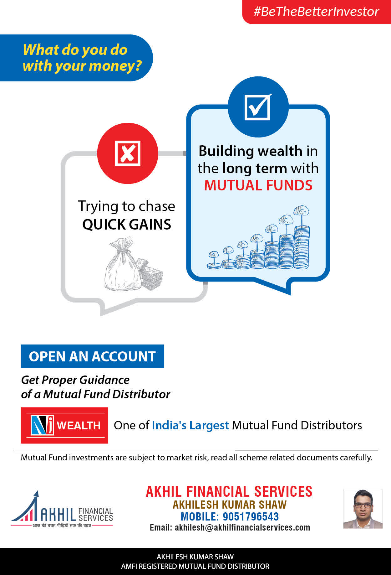 At, Akhil Financial Services our mission is to provide our clients with the best solutions in wealth creation and wealth management. We are driven to provide clients with simple, unbiased and uncluttered professiaonal advice that adds value to their quality of life and results in actionable solutions.